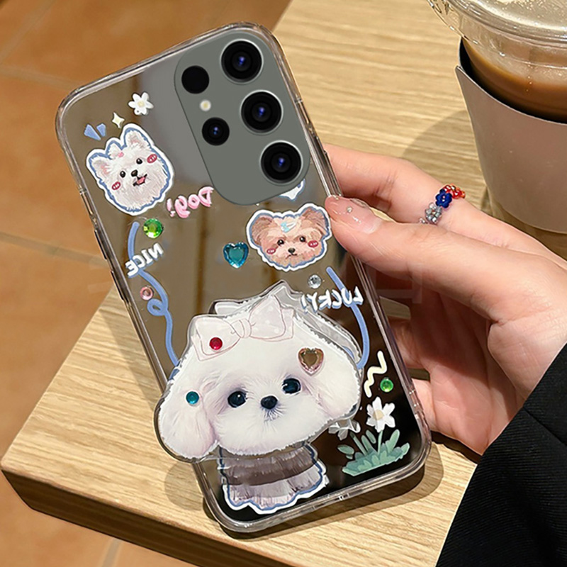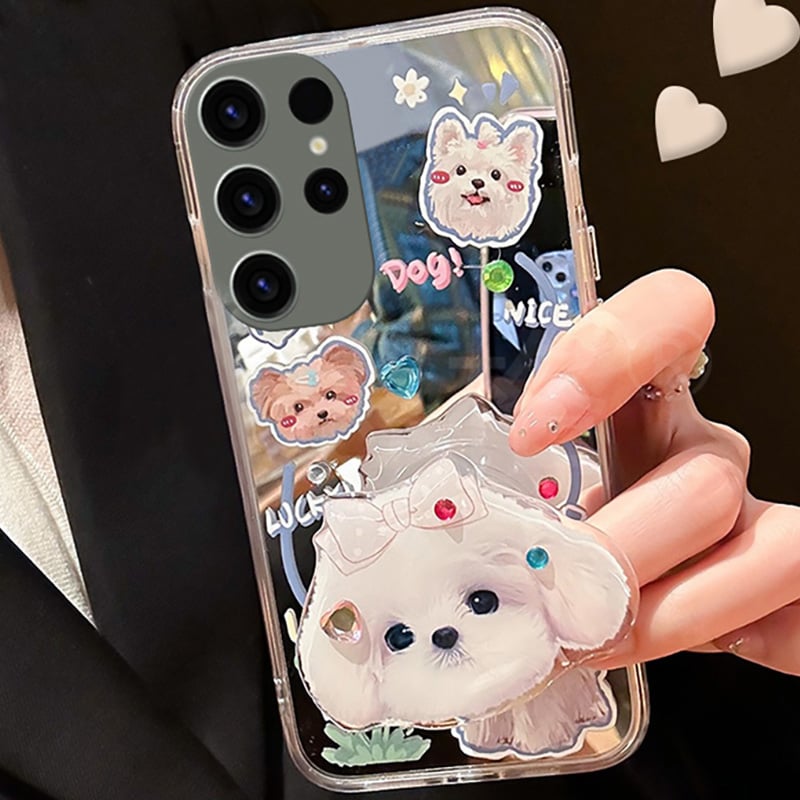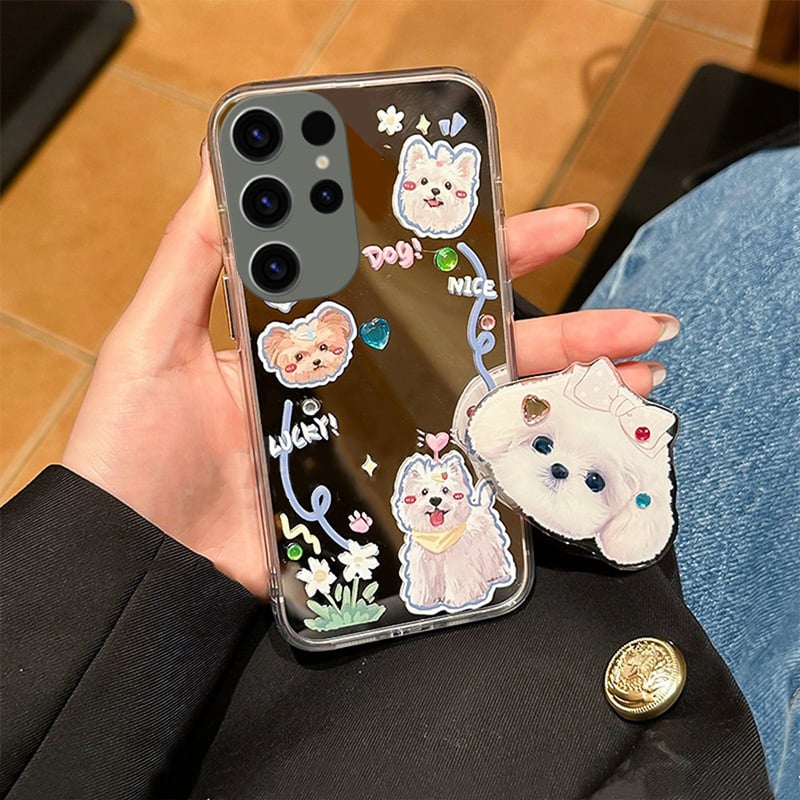 This mirror case with dog pattern is available for Samsung S 23/22/21/20, Note 20.