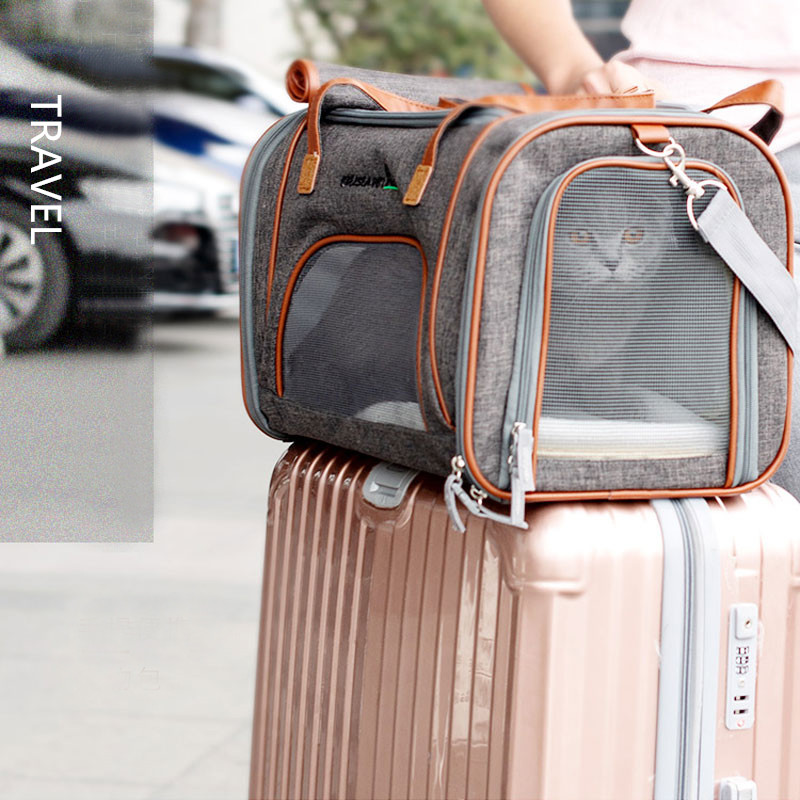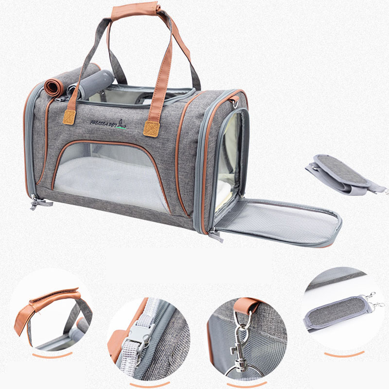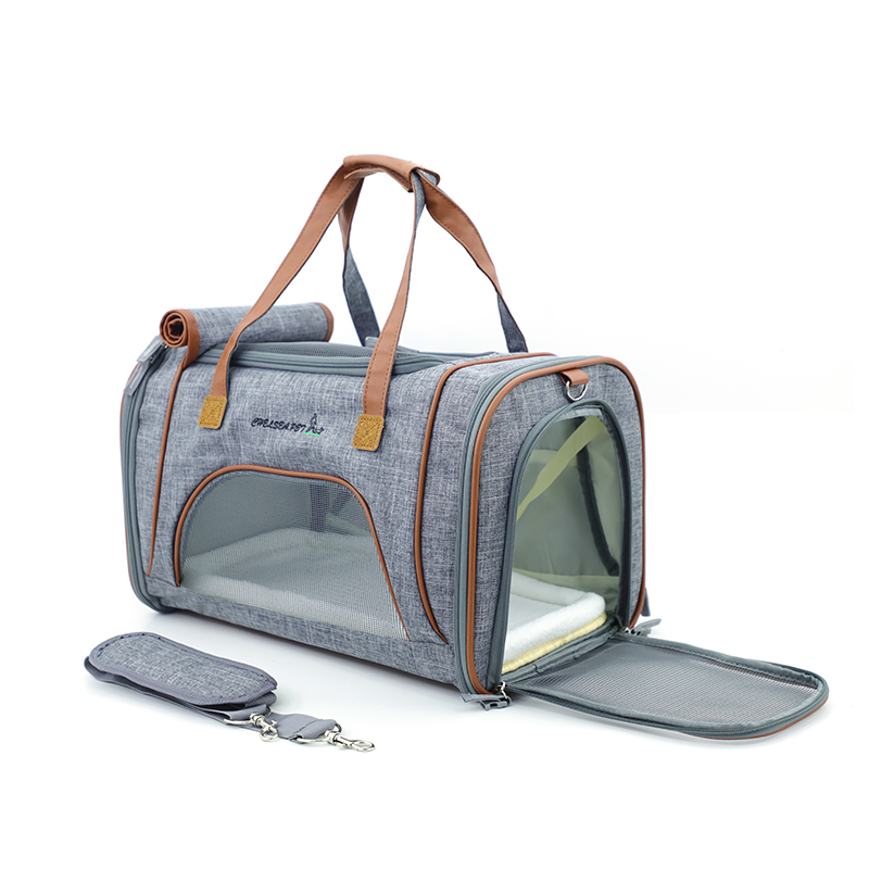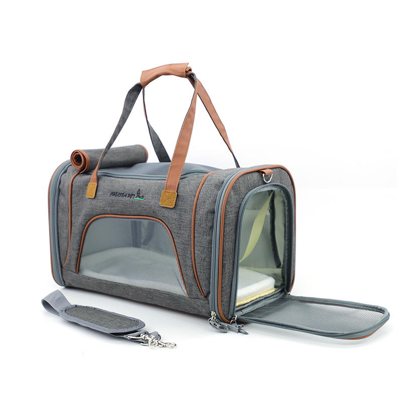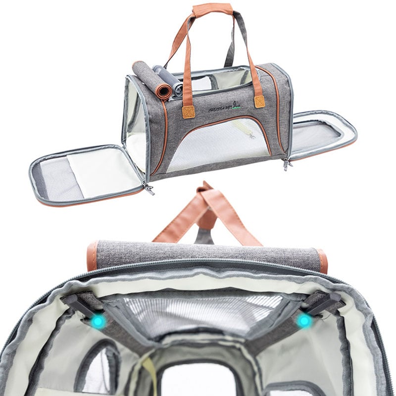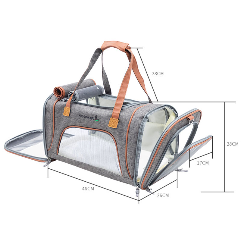 There are 5 color for the dog & cat handbag, Pink, Khaki, Blue, Dark grey, Light grey. The bag can fold up, easy to carry outside.